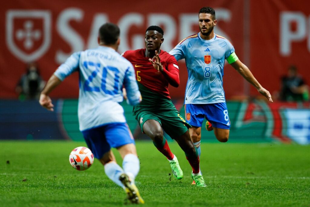 Na partida, que tinha os bilhetes esgotados há várias semanas, os seleccionados de Luís Enrique entraram sabendo que só a vitória valia, mas na primeira parte não conseguiram assustar o guarda-redes Diogo Costa. Ao contrário, Portugal teve oportunidades de golo (3) que saíram dos pés de Diogo Jota (por duas ocasiões) e Bruno Fernandes. Ronaldo teve mais uma noite desinspirada e João Félix assistiu ao desenrolar do jogo fazendo aquecimentos na linha lateral.