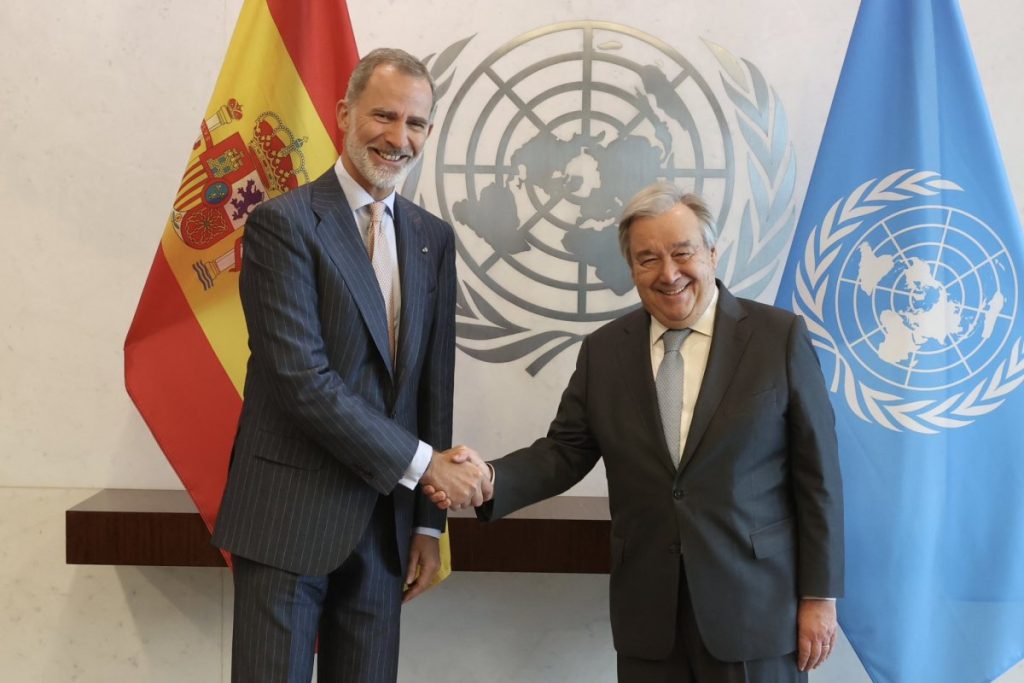 Antes de discursar (o tema será a defesa do Estado de direito), o rei encontrou-se (pela sétima vez) com o secretário-geral, o português António Guterres, com quem almoçou. Em Maio tinham estado juntos em Cáceres, localidade em que Guterres recebeu o Prémio Europeu Carlos V. Ainda durante esta semana, António Guterres lançou uma campanha para alertar as nações do mundo para que regulem, apressadamente, a inteligência artificial (AI) e os malefícios que a mesma pode trazer em temáticas tão frágeis como a guerra.