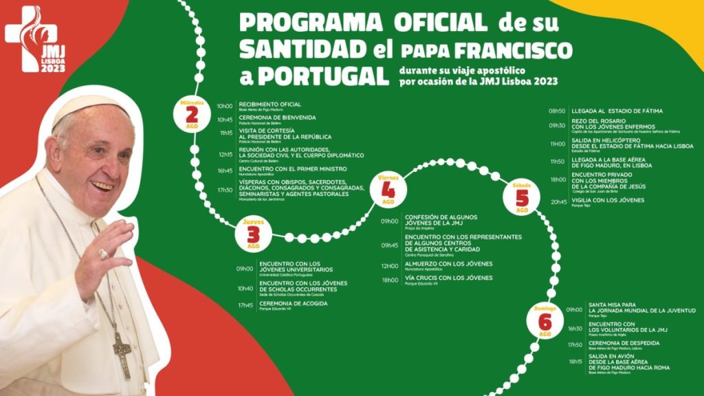 – 6 días. La JMJ se desarrolla entre el 1 y el 6 de agosto. El papa Francisco llegará el día 2 y permanecerá en Lisboa hasta el 6, con una breve visita de dos horas a Fátima el día 5.