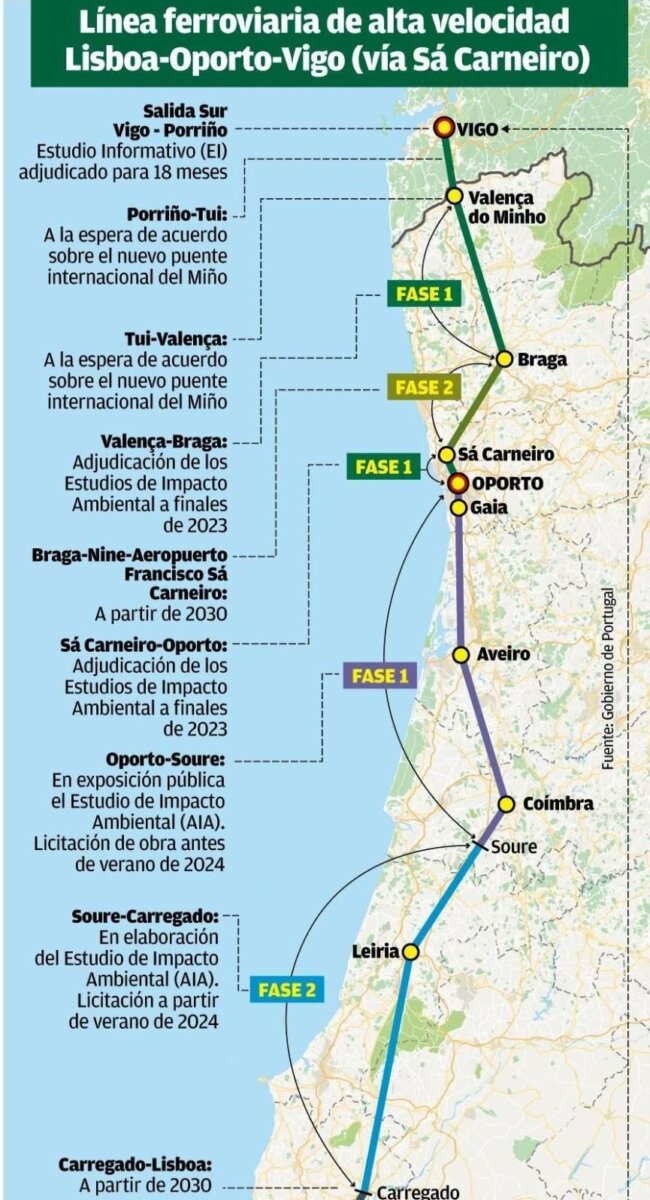 El primer tramo de la línea, que unirá Lisboa y Oporto y se extenderá hasta Galicia, incluye la reforma de la estación intermodal de Campanhã, un nuevo puente sobre el río Duero y una estación en Gaia con enlace al metro. Se espera que este tramo esté en servicio antes de 2029, permitiendo reducir los tiempos de viaje entre ambas ciudades a 120 minutos. La segunda fase del proyecto, que se prolongará hasta Carregado, cerca de Lisboa, está en proceso de elaboración del Estudio de Impacto Ambiental (EIA), y la adjudicación de las obras se espera para después del verano de 2024. La línea de Oporto a Vigo, sin embargo, avanza a un ritmo más lento, con solo el 10% del trazado en marcha.
