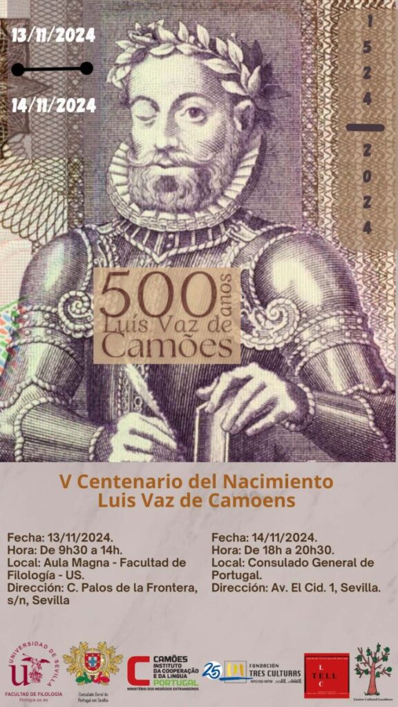 El Consulado General de Portugal en Sevilla y la Universidad hispalense celebran el V Centenario del nacimiento de Luís de Camões, los días 13 y 14 de noviembre de 2024. En el homenaje, se realizarán varias sesiones académicas en la universidad y la proyección de un audiovisual, así como una conferencia en el consulado, donde también participan el Instituto Camões, la Fundación Tres Culturas del Mediterráneo y Centro Cultural Lusófono de la capital sevillana. El programa académico comprende conferencias que explican la vida y obra del autor de Os Lusíadas, con el foco puesto en sus temáticas, su poética y su influencia en el humanismo.