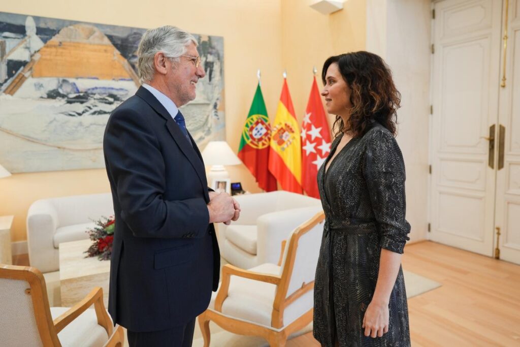 La presidenta de la Comunidad de Madrid, Isabel Díaz Ayuso, ha mantenido un encuentro en la Real Casa de Correos, sede del Gobierno regional, con el embajador de Portugal en España, João Mira Gomes, para reforzar los lazos comerciales y culturales con el país vecino.
