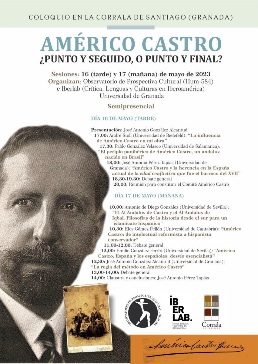 La Corrala de Santiago de Granada acoge los días 16 y 17 de mayo un coloquio sobre Américo Castro: ¿Punto y seguido, o punto final? Este evento es producto del empeño de José Antonio González Alcantud, Pablo González Velasco y José Antonio Pérez Tapias para rescatar -desde Granada y Andalucía- este personaje “maldito”, envuelto en un “espeso y sospechoso silencio”. Este coloquio está organizado por el Observatorio de Prospectiva Cultural (Hum-584) e Iberlab (Crítica, Lenguas y Culturas en Iberoamérica) de la Universidad de Granada.