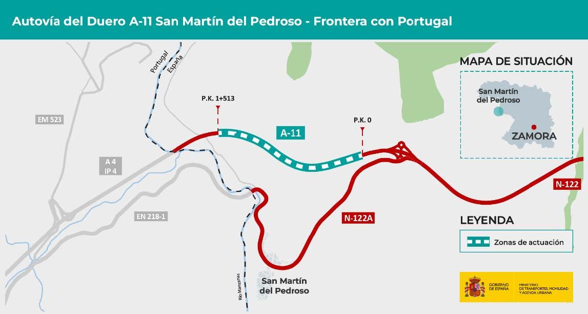 El Ministerio de Transportes, Movilidad y Agenda Urbana (Mitma) ha licitado un contrato de obras, por importe de 8,23 millones de euros (IVA incluido), para la construcción del tramo Enlace San Martín Del Pedroso – Frontera Portuguesa”, de la Autovía del Duero A-11, en la provincia de Zamora, tal y como ha sido anunciado hoy en el Boletín Oficial del Estado (BOE).
