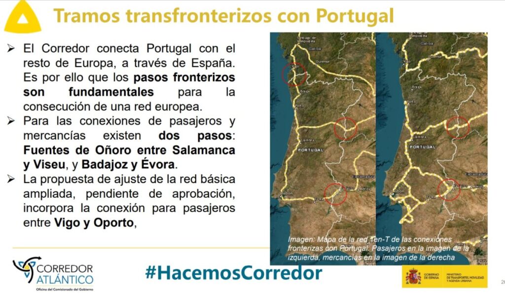 El Corredor conecta Portugal con el resto de Europa, a través de España. Los pasos fronterizos son fundamentales para la consecución de una red europea. Uno de los principales objetivos del Corredor Atlántico es favorecer el transporte ferroviario de mercancías con la mejora de las vías y las conexiones ferroportuarias, el desarrollo de polos logísticos, impulsando el uso de las autopistas ferroviarias.