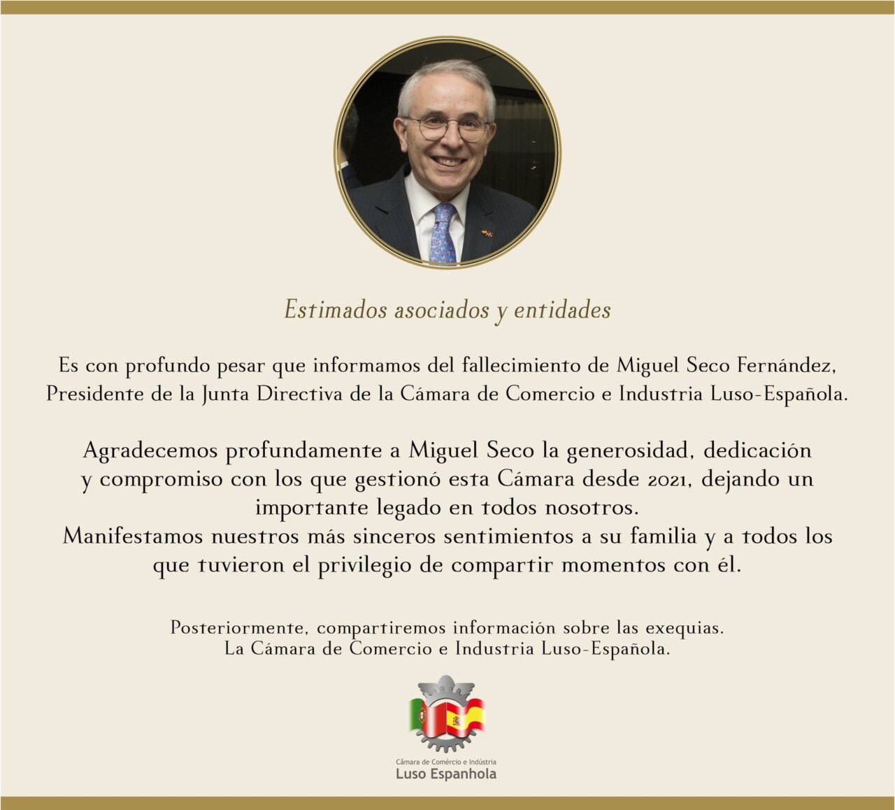 El presidente de la Cámara de Comercio Luso-Española, Miguel Seco, ha fallecido en Lisboa a la edad de 64 años, tras una súbita dolencia infecciosa de la que era atendido desde hacía semanas en el Hospital de Cascais. Nacido en Santiago de Compostela y formado en ESADE, desarrolló su carrera en la banca, primero en Madrid como directivo del Banco Português do Atlántico y, desde 2001, en Lisboa, en el Millennium BCP como responsable de las relaciones con las empresas españolas radicadas en Portugal. Tras su larga experiencia en la banca portuguesa, Miguel Seco se incorporó a la delegación del Banc Sabadell en Lisboa.