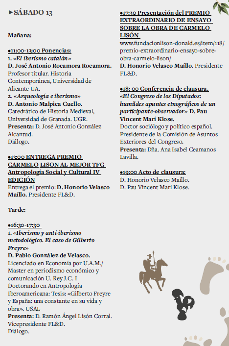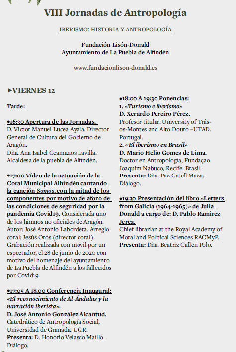 El presidente de la Comisión de Asuntos Exteriores del Congreso, Pau Vincent Marí Klose, dará la conferencia de clausura: “El Congreso de los Diputados: humildes apuntes etnográficos de un participante-observador”. La apertura de las jornadas estará a cargo de Victor Manuel Lucea Ayala, director General de Cultura del Gobierno de Aragón, y Ana Isabel Ceamanos Lavilla, alcaldesa de la Puebla de Alfindén. Se expondrá un vídeo de la actuación de la Coral Municipal Alhindén cantando la canción “Somos”, considerada uno de los himnos no oficiales de Aragón, cuyo autor es José Antonio Labordeta (arreglo coral de Jesús Orós). También habrá una presentación del libro “Letters from Galicia (1964-1965)” de Julia Donand a cargo de Pablo Ramirez Jerez; así como el anuncio de la presentación del Premio Extraordinario de Ensayo sobre la obra de Carmelo Lisón, y la entrega del Premio al Mejor TFG.