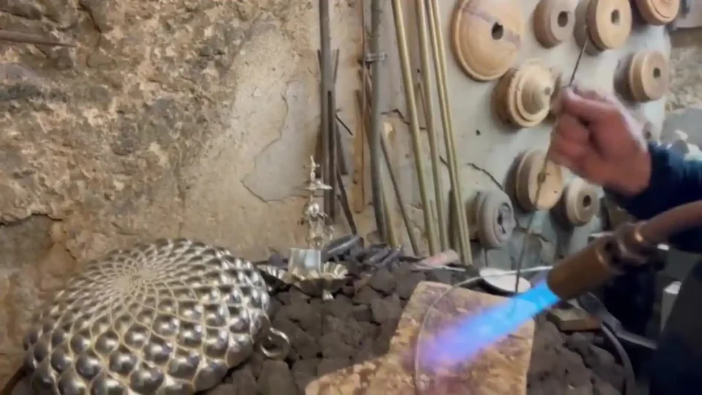 Cálices, incensarios, cruces y coronas de vírgenes se esparcen por su interior, algunos ya reparados y otros a la espera de lucir como nuevos. Los sonidos de su labor son de otra época y resultan tan especiales que incluso un día una turista se metió en el taller a grabarlos para un pódcast. El único artefacto tecnológico que hay en este lugar angosto es el teléfono móvil de Nuno, comenta él mismo divertido en una mezcla de castellano, portugués y gallego, al tiempo que apunta que el boca a boca es la manera de promocionarse.