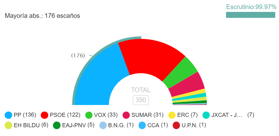 El PP gana en votos y escaños pero el PSOE tiene más capacidad de conseguir una mayoría para la investidura 24 julio, 2023