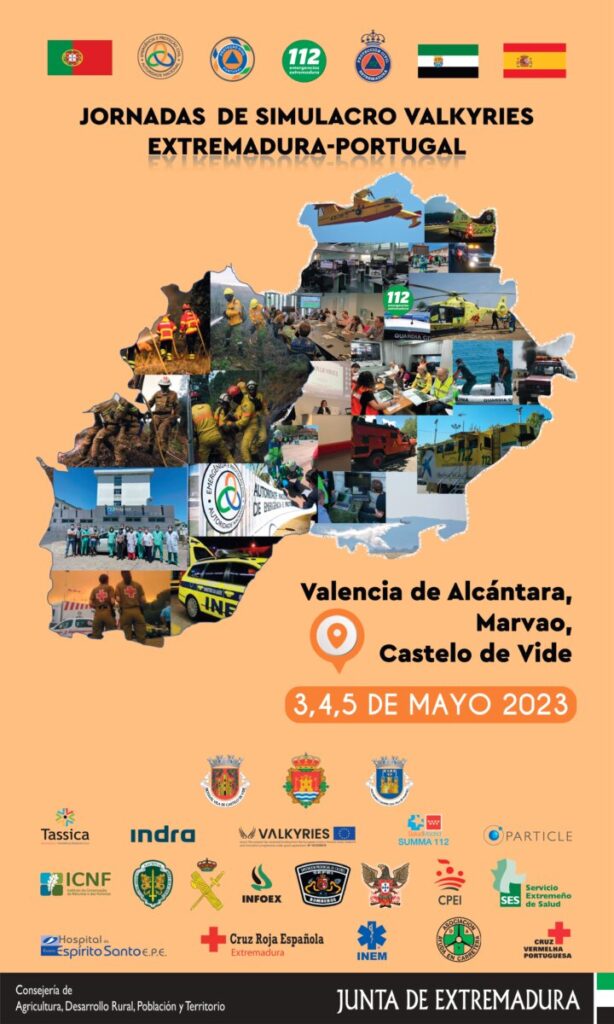 El simulacro se enmarca en las Jornadas Valkyries Extremadura-Portugal que se celebrarán el 3 en la Casa de Cultura de Valencia de Alcántara y el viernes, día 5, en Castelo de Vide. En dichas jornadas se presentará el Proyecto Valkyries, planes, protocolos de actuación y coordinación que aplican Extremadura y Portugal para dar respuesta coordinada a grandes emergencias transfronterizas como grandes incendios forestales y accidentes de múltiples víctimas. Además, habrá demostraciones de las aplicaciones que se están desarrollando en el Proyecto Valkyries y se presentará el nuevo sistema integral de gestión de emergencias del 112 y el sistema de gestión de emergencias ANEPC de Portugal.