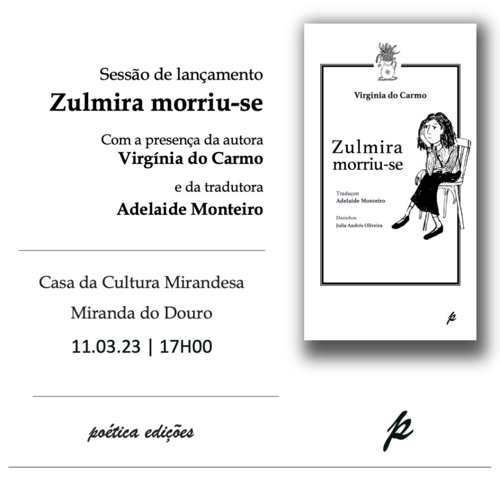 Sabaria*, asociación sin ánimo de lucro formada por varios profesores de Zamora (España), acaba de publicar dos nuevas traducciones: ‘Zulmira morreu’, de Virginia do Carmo, y ‘Un mapa de Lisboa’, de Pablo Javier Pérez López. La primera ha sido traducida al español por la promotora del grupo, Concha López Jambrina, y al mirandés por la poeta portuguesa Adelaide Monteiro para Poética Edições. El segundo libro es una guía espiritual, literaria e irónica sobre la ‘portugalidad’. Otra publicación reciente de este grupo ha sido ‘Obra Poética’, de Luís Falcão, con traducción de Pérez López. Los libros de esta asociación se pueden obtener en Facebook, Instagram o en el correo electrónico sabariaeditorial@gmail.com.