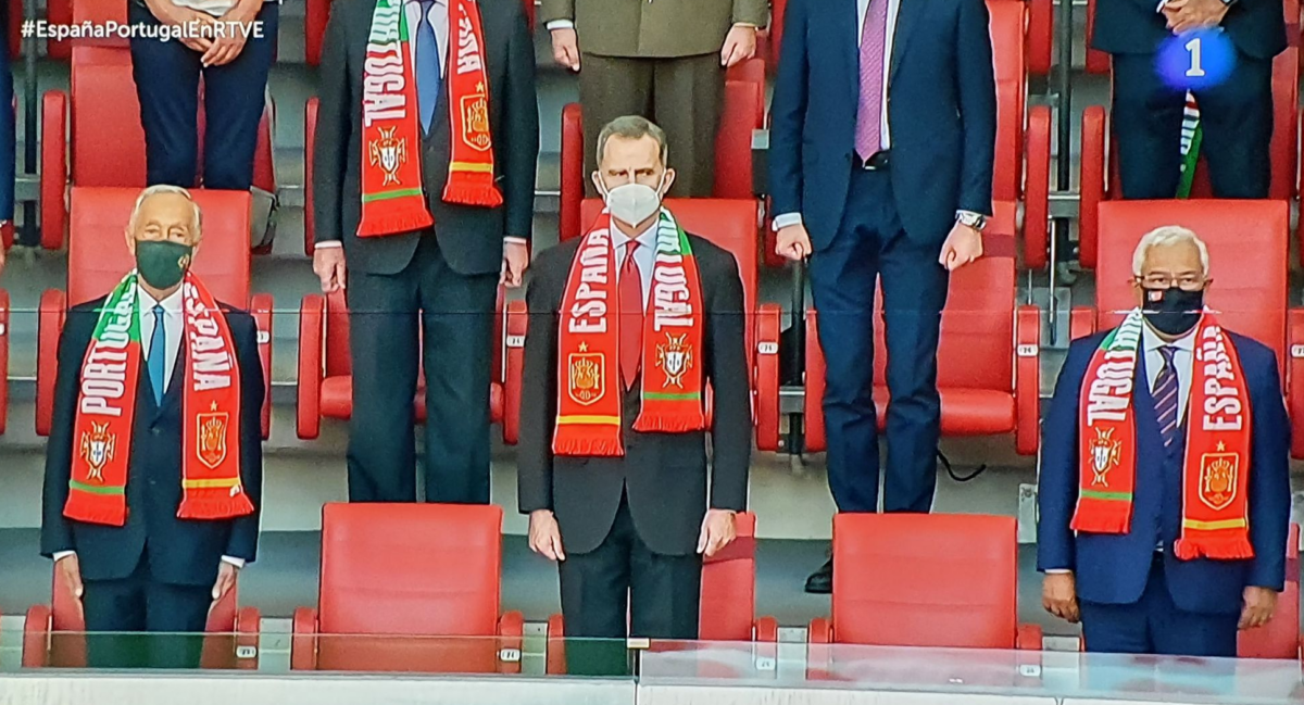 Los jefes de Estado y de Gobierno se han puesto bufandas con los nombres de España y Portugal, mientras que los jugadores de ambas selecciones han llevado en la camiseta una referencia a la candidatura ibérica. La noche de la víspera se iluminaron las fachadas del estadio Metropolitano y del Ayuntamiento de Madrid en Cibeles con los colores de Portugal. Previamente a los actos, Felipe VI ha recibido a Marcelo Rebelo de Sousa en el Palacio Real y han comido juntos en una terraza de un restaurante de la plaza de Oriente.