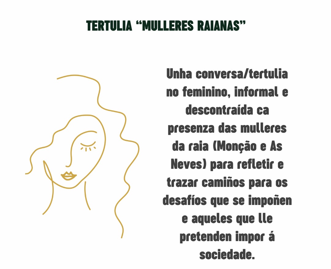 Este foro de conversa, sen formalismos, está aberto a todas as mulleres, independentemente da súa idade ou profesión. O obxectivo é dar voz ás súas inquedanzas e necesidades, así como construír colectivamente alternativas para un futuro máis igualitario e próspero. A través desta tertulia, búscase poñer en valor o papel das mulleres na sociedade raiana, abordando temas como a igualdade de oportunidades, os dereitos laborais, o emprendemento e o acceso a recursos.