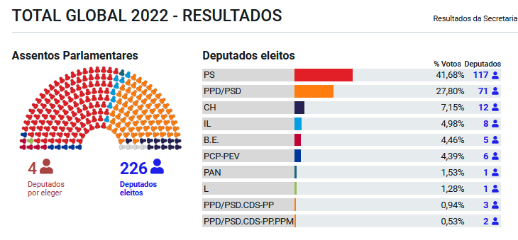 El actual primer ministro de Portugal desde 2015, el socialista António Costa, ha logrado la mayoría absoluta de los diputados de la Asamblea de la República, concentrando el voto útil de la izquierda. Costa ha pasado de la necesidad imperiosa de la negociación presupuestaria, en el marco de la alianza parlamentaria de la geringonça, a meterse directamente el juguete de la geringonça en el bolsillo: ya no necesitará el apoyo parlamentario de un Partido Comunista y un Bloco de Esquerda en claro declive.