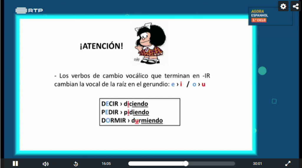 Todos los lunes y jueves, a partir de las 15:20 horas, el español de iniciación llega a la pantalla. Durante treinta minutos, los alumnos de séptimo a noveno año que hayan elegido esta como su segunda lengua extranjera (la otra opción es el francés), van a dar los primeros pasos en la lengua de Cervantes, o del recientemente fallecido Luís Sepúlveda. Todas estas clases se imparten con la presencia de un profesor, que está en el plató de la televisión pública, en Lisboa. Allí se recurre a vídeos para complementar las materias que los profesores mandan a sus respectivos alumnos. Unos alumnos que tuvieron que abandonar las aulas y sustituirlas por sus casas debido a la pandemia de la covid-19.