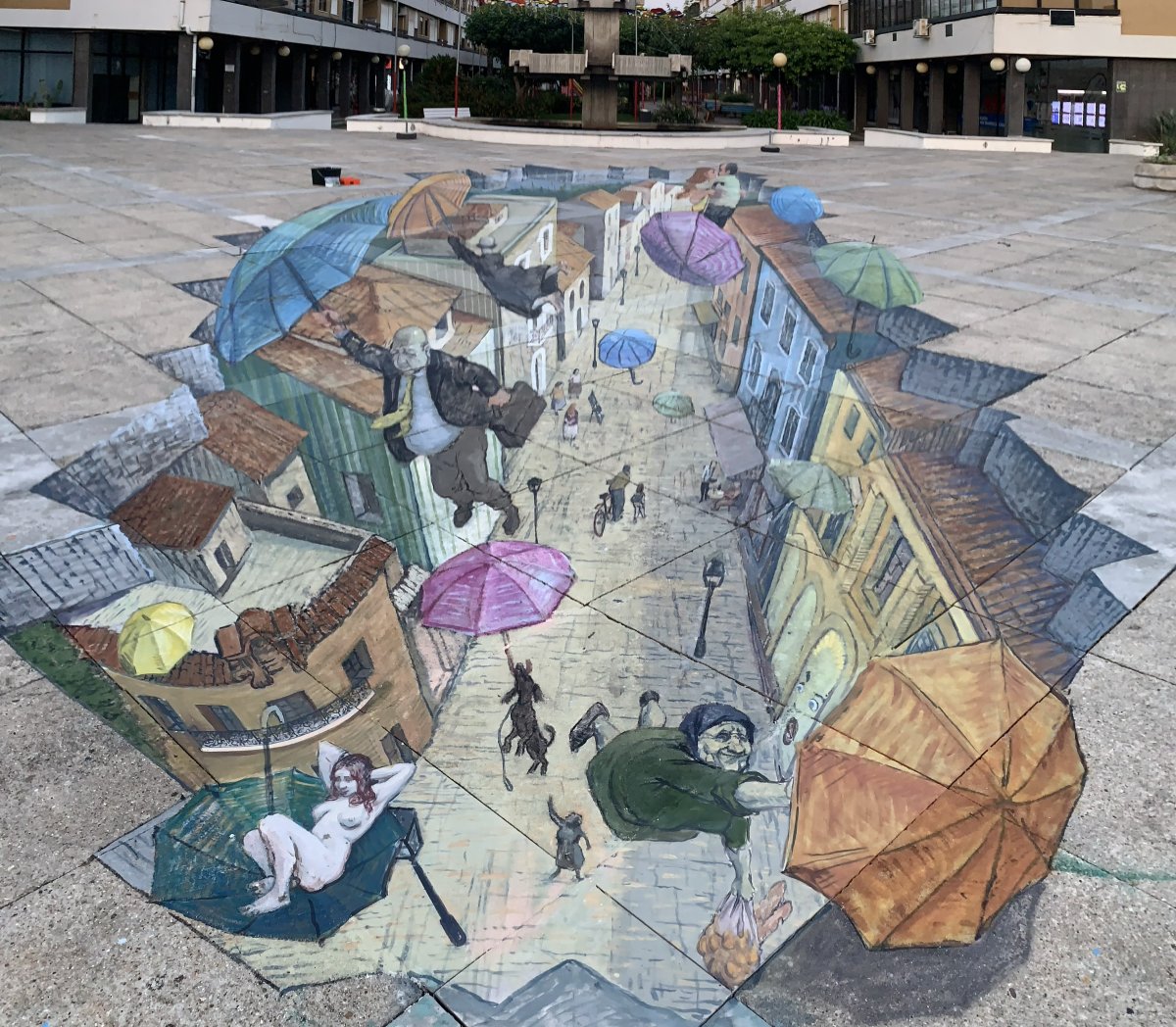 Na altura, eu não conhecia muito bem o anamorfismo. Sabia a teoria, mas nunca a tinha praticado. E, a partir deste primeiro trabalho, nunca mais parei de fazer isto. Antes fazia um trabalho clássico pela minha formação de artista. Também estudei arquitetura. Mas esta técnica permitiu desenvolver-me enquanto artista. Através dela, posso fazer aquilo que gosto, desde a sátira social ao retrato da condição humana.